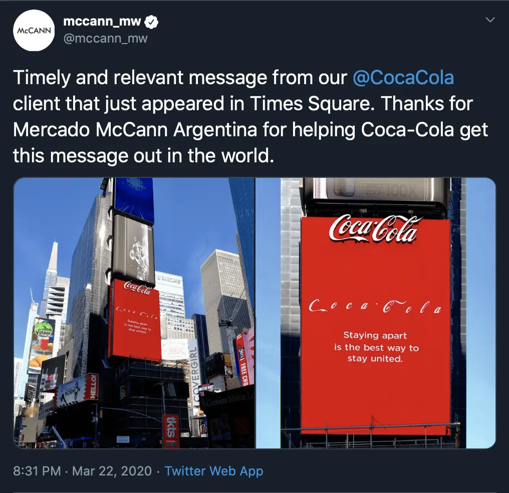 Uno de los elementos con los que más han jugado las marcas han sido los logos: Miss Chiquita ha enviado su personaje a casa para cumplir con el confinamiento y Starbucks le ha puesto una mascarilla al suyo. Otras marcas como Coca – Cola, Audi, o McDonald’s han separado las letras de sus logotipos para cumplir con la distancia social recomendada.